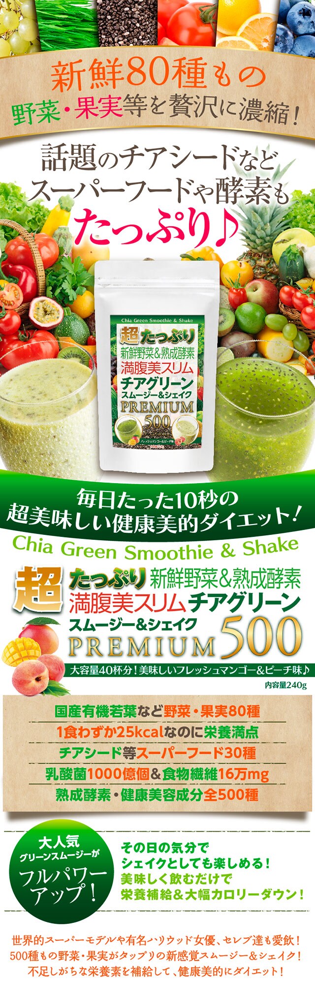 - 超タップリ新鮮野菜&熟成酵素☆満腹美スリム☆チアグリーンスムージー&シェイクPREMIUM500【シェイカー無】