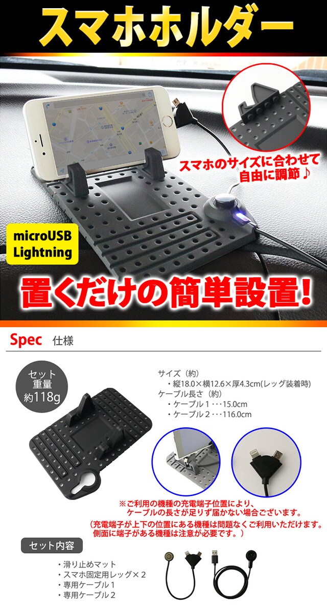 ・セット内容:滑り止めマット/スマホ固定用レッグ×2/専用ケーブル1/専用ケーブル2