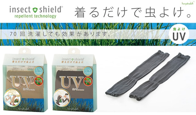 「虫よけUV 2wayフット&アームカバー」は、アメリカで認められた防虫技術 「insect shield[インセクトシールド]」を利用した防虫UVウェアです。