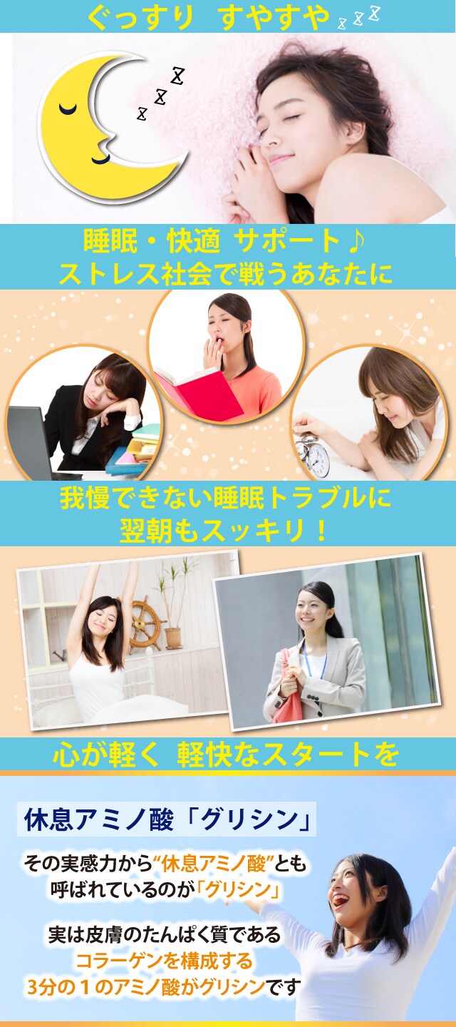 1日の終わりにしっかりと休息が取れないと、寝起きがつらかったり仕事中の眠気やあくびが止まらないなんてことも。。。休息アミノ酸とも呼ばれるグリシンがそんなお悩みをしっかりサポート♪