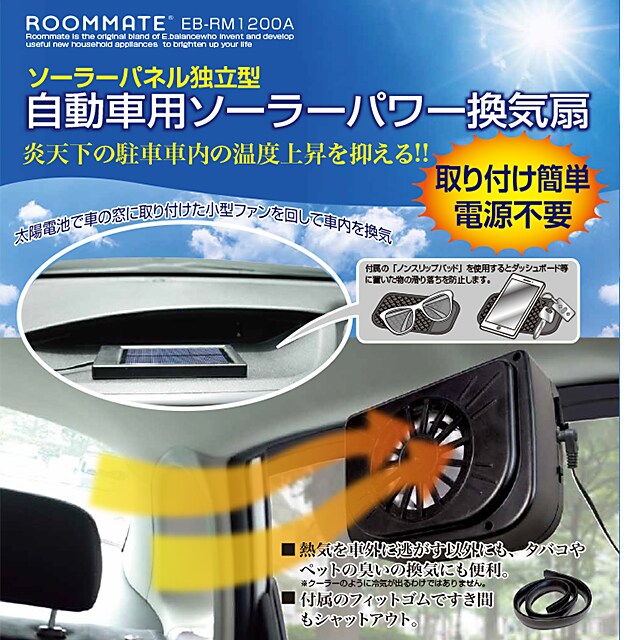 ROOMMATE 自動車用ソーラーパワー換気扇 EB-RM1200A | 炎天下の駐車車内の温度上昇を抑える!!