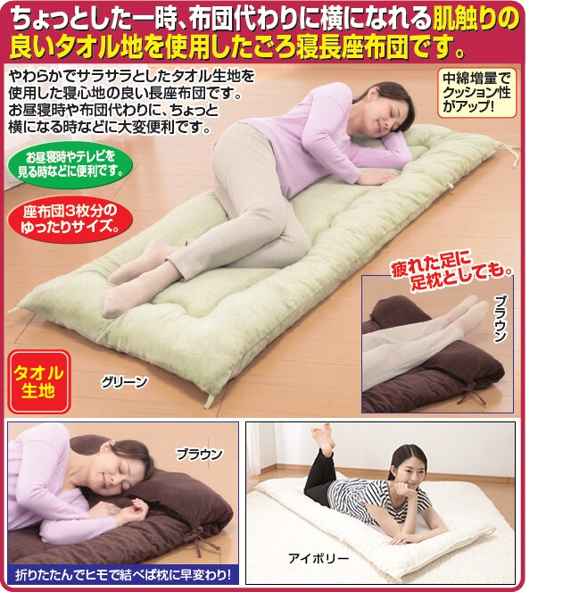 [アイボリー]さわやかタオル地ごろ寝 | ちょっとした一時、布団代わりに横になれる肌触りの良いタオル地を使用したごろ寝長座布団です