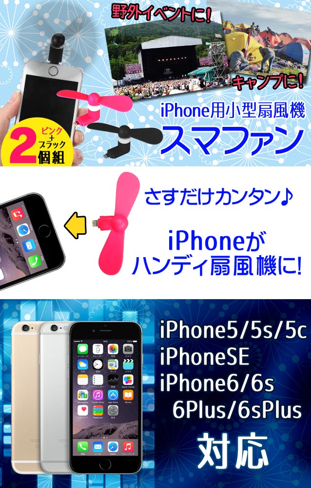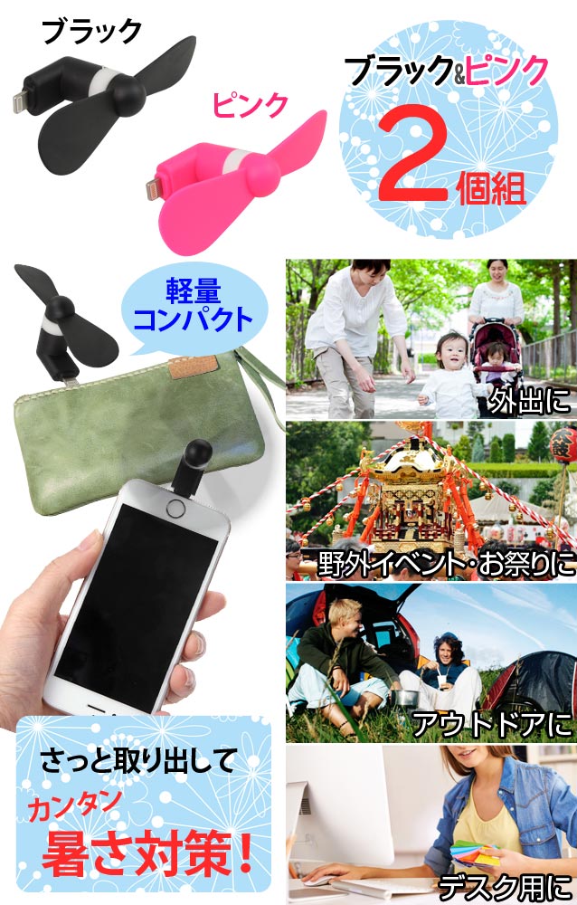 iPhone用小型扇風機「スマファン」 2色 計2個 | コネクタに挿すだけでどこでも使える♪