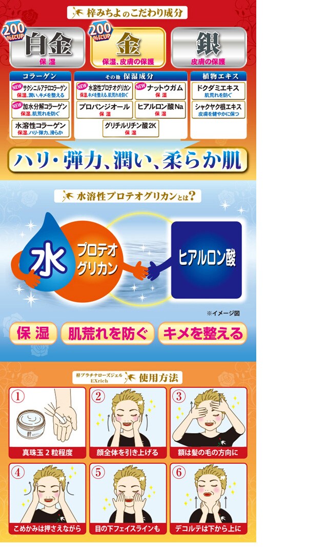 金(保湿)・銀(皮膚の保護)・プラチナ(保湿)に加え、植物由来の成分など贅沢な美容成分配合で、ハリ、ツヤ、潤いを保ちしっとり柔らかな肌へ整えます。オールインワンジェルだから、お顔はもちろんのこと、気になる首や胸元などのスキンケアとしてもお使いいただけます。