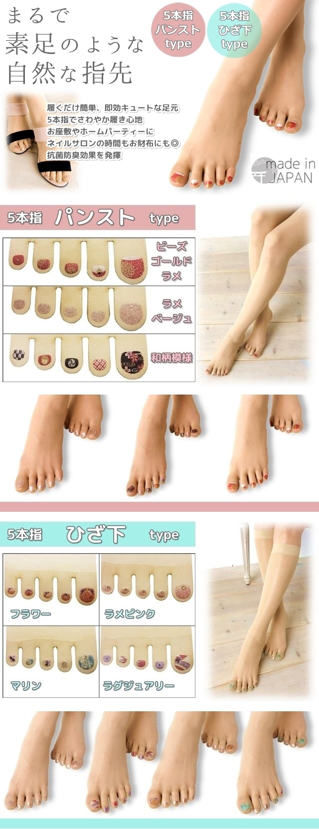 [ラメピンク&マリン]ペディキュア5本指ストッキング(ひざ下タイプ) 2種計2足|履くだけ簡単♪素足みたいにかわいいペディキュア付きストッキング
