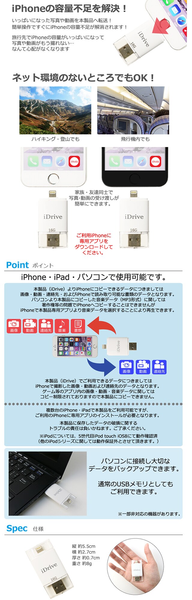 iPhone USBメモリ 16GB | メモリを気にせず思い出の写真・動画をいっぱい撮ろう!!iPhone用 USBメモリ!容量がなくて困っている人にオススメ
