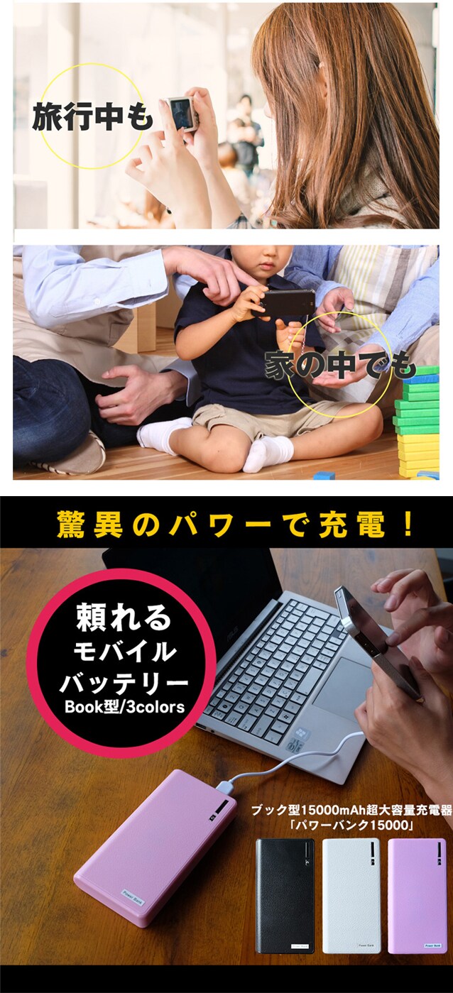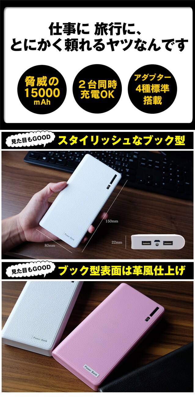 パワーバンクがあれば電池残量を気にすることなく、安心してスマホをお使いいただけます!仕事中でも!外出中でも!旅行中も!家の中でも!脅威の大容量でスマホの電池切れをカバー!頼れるモバイルバッテリー『パワーバンク15000』