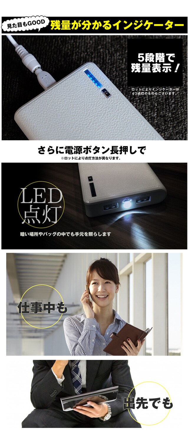 ・本商品のmAh(アンペア)の表記は電池の容量です。一般的に、電気回路の構造上スマートフォンなどの機器に充電できる容量はそれより幾分下がりますので、ご了承ください。