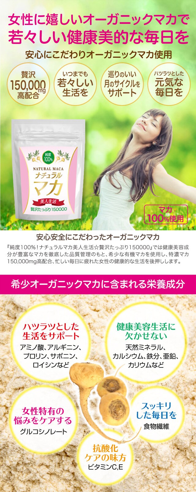純度100%!ナチュラルマカ美人生活☆贅沢たっぷり150000 90粒 | 年齢や疲れを感じる女性のために"希少有機マカ使用"アミノ酸やなど健美成分たっぷり♪
