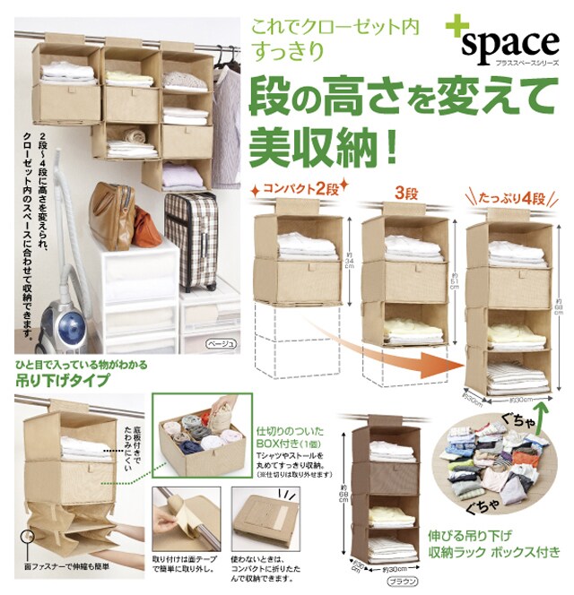 [ベージュ]伸びる吊り下げ収納ラック ボックス付 2個セット | これでクローゼット内すっきり!段の高さを変えて美収納!