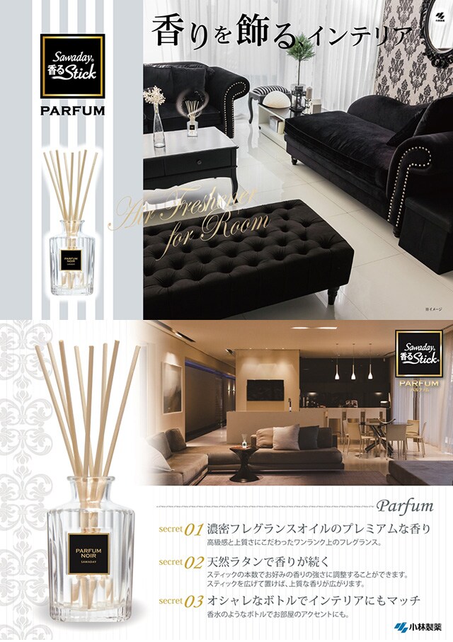 ワンランク上の香りとデザインのスティック芳香剤。濃密フレグランスオイルを使用したプレミアムな香水調の香りが、天然ラタンのスティックを通じてお部屋全体に広がります。