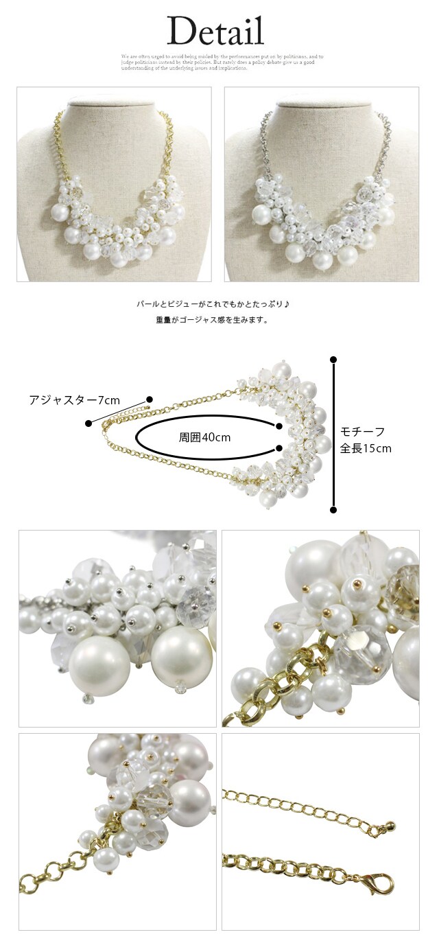 ホワイトパールとクリアビジューをたっぷり使用した、ずっしりとした重量感のあるボリュームネックレス。太めのチェーンでバランスよく仕上げました♪裏表なく使えるので、急いでいる時もさっと着用可能なのがウレシイ♪ワンポイントだけ華やかにしたい、大人めなワンピースピッタリ!ドレスなどを着たときには一番上品でキレイに見える長さなので