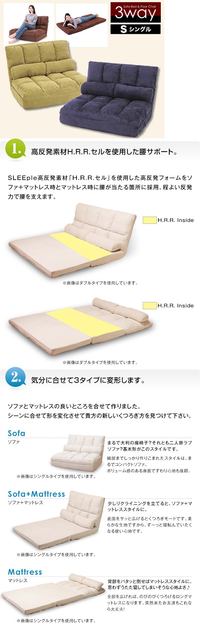 1つで3役。ふっくら気持ちいい、マットレス感覚のソファベッド。リクライニングチェアを広げるとソファベッドに、折りたたむとソファに早変わり!背もたれ13段階リクライニング。枕変わりにも使える便利な同色クッション2個付き。快適な座り心地の高反発ウレタン。
