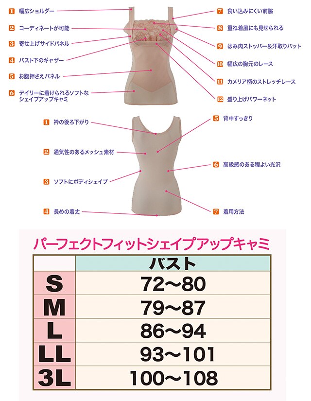 デイリーに着けられるソフトなシェイプアップキャミです。キャミソールなのにシェイプアップ機能があり、バストを美しく見せるバストアップ機能を兼ね備えているのがポイント。胸元のレースは幅広で、ブラジャーや胸元のチラ見えを防止します。ショルダー部分は安定感のあるタンクトップ型。広い面で支えるため、肩への負担を軽減します。肩ひもがずれる心配も少なく、安定感のある着け心地です。お腹部分はパワーネットを2重に。気になるお腹をしっかりとシェイプし、段差をなくしすっきりと見せてくれます。全体に使用しているのはパワーネット。柔らかく肌触りが良いので、ソフトにボディシェイプができます。また、適度な伸縮性がありソフトな伸び感で体にフィットし、着心地のよさを感じていただけます。