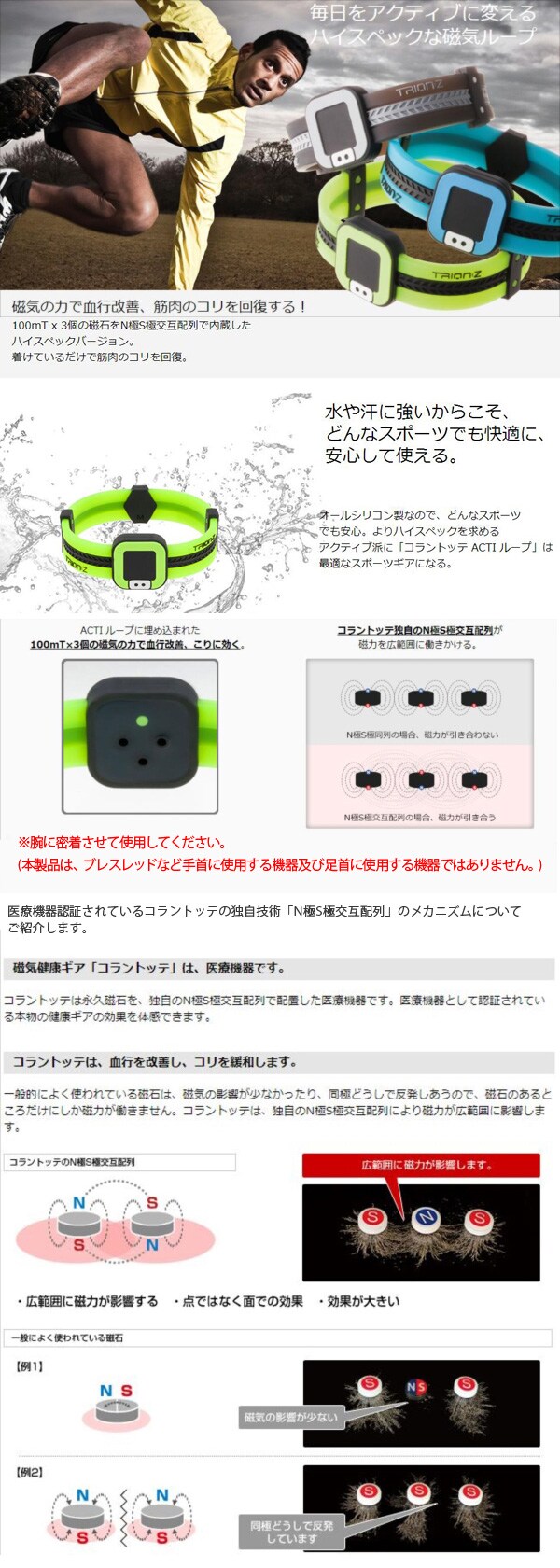 ◆フェライト永久磁石100mT×3個をN極S極交互配列。この配列によって点ではなく面での効果を得ることができ、着用しているだけで装着部位のコリに効きます。これにより磁力が広範囲に働きかけることができます。