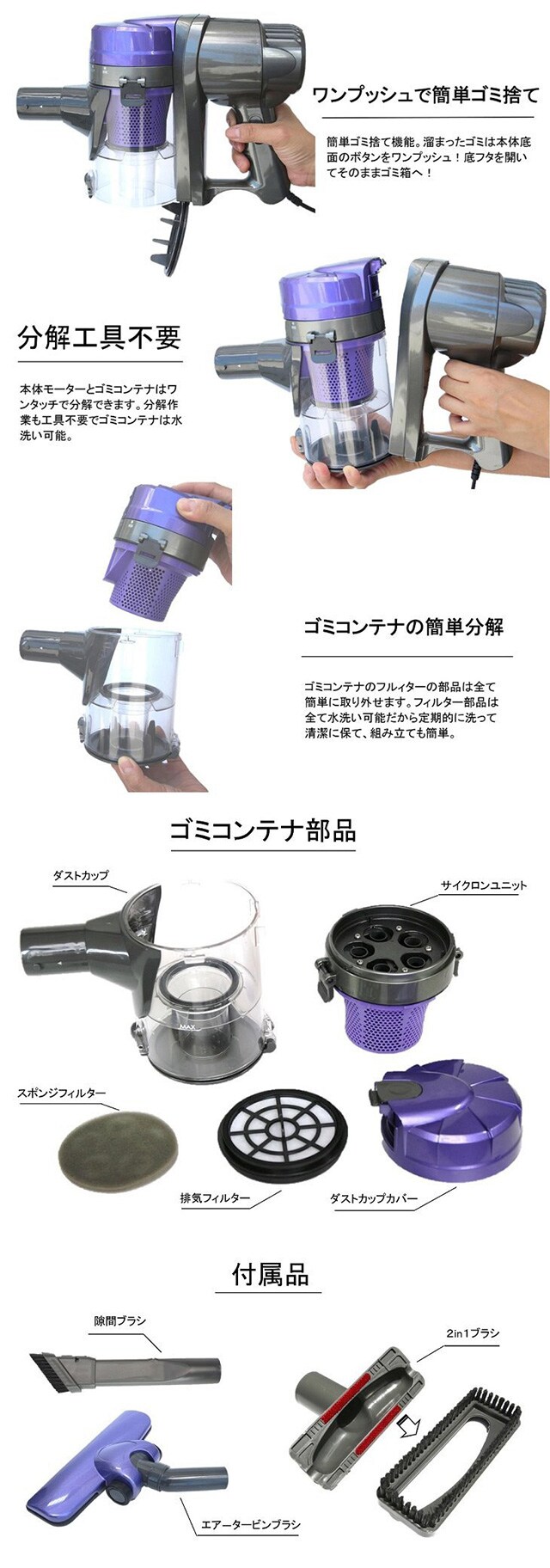 本体モーターとゴミコンテナはワンタッチで分解できます。分解作業も工具不要でゴミコンテナは水洗い可能。