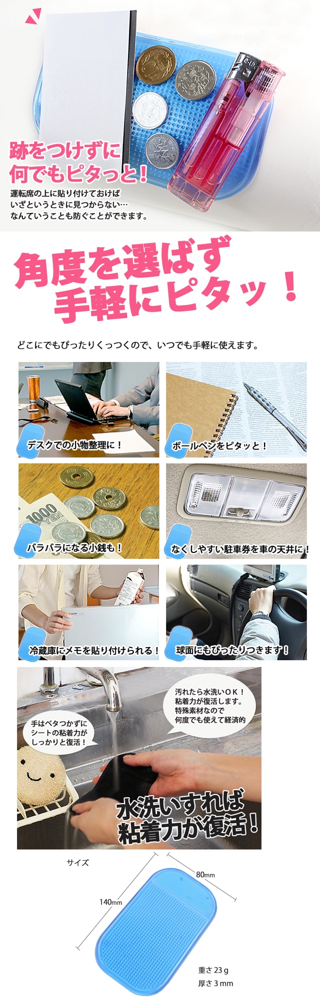 車で斜めになっているところでもピタットくっつくので、めがね・タバコ・名刺等をおけて場所をえらびません。