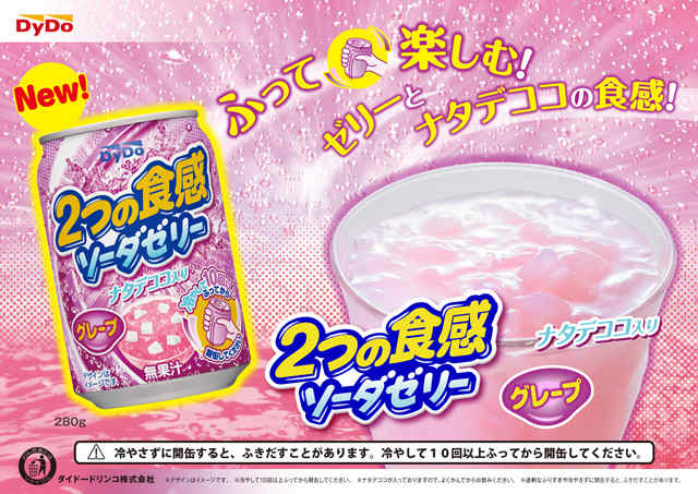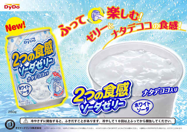 炭酸の“しゅわしゅわ”した爽快感と、ゼリーの“ぷるぷる”した食感をかけ合わせた炭酸ゼリーに、“ナタデココの歯ごたえ”をプラス。振ると2つの食感が同時に味わえる新食感のデザート炭酸飲料。特許製法を元に開発されたオンリーワン商品です。