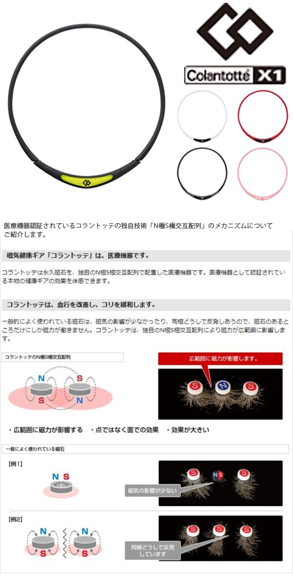 コラントッテ独自のN極S極交互配列になっており、広範囲に磁力が影響して血行を改善し、首コリ、肩コリの解消のお手伝いをします。