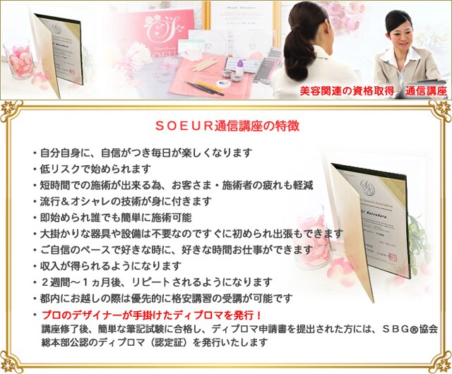 履歴書にも書ける資格・終身資格で、更新も不要。資格取得後は出張開業や自宅サロン開業、スクール講師を目指せます。好きな時間にテキストを基に何回でも学習できる通信講座なので、家事や子育てに忙しい主婦の方にもオススメ。丁寧で迅速なメールサポートも行っています。受講後、試験に合格すると、ディプロマを発行致します。