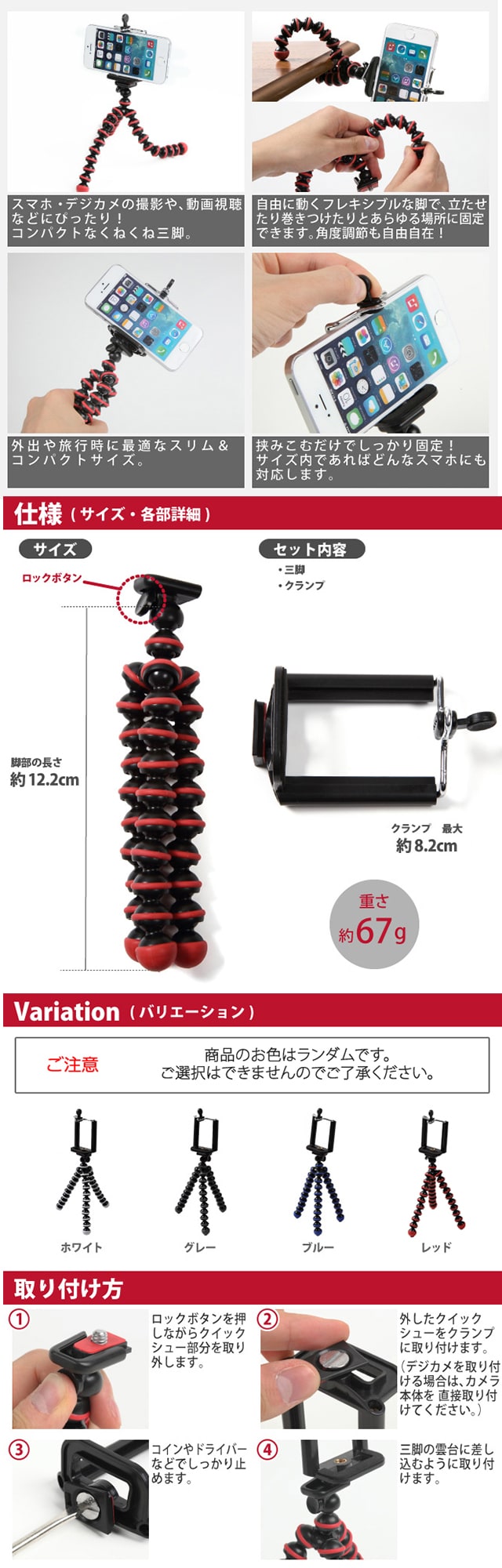 くねくね三脚 | スマホ・デジカメでの撮影が簡単に!自由に足を曲げられ色々な場所に設置可能(カラーはランダム)