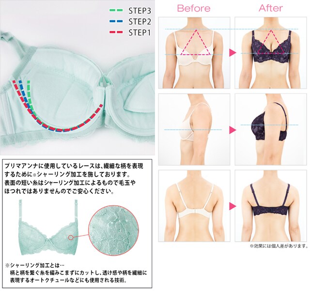 step1ブラの中で比較的広いワイヤ—円郭と、高めのカップサイド設計が、脇や背中から集めたお肉を、カップにキープし逃がしません。