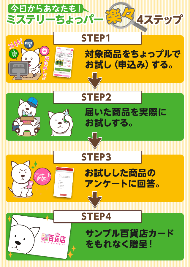 興味を持っていただいた商品をお試しいただき、そこで感じられた、みなさまのご意見・ご感想を、消費者の生の声として 企業に届ける新たなサービスが「ミステリーちょっプル」。