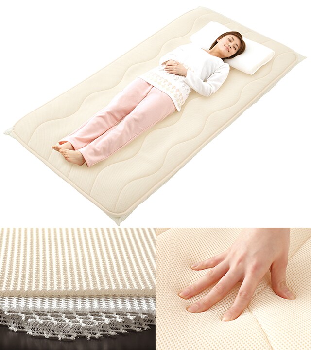 ・立体編みメッシュのマットは通気性抜で蒸れを軽減し、冬は湿気を溜め込まず冷えを押さえ、夏はムレを軽減するため爽やかで涼しく、一年中快適な睡眠を実現します。