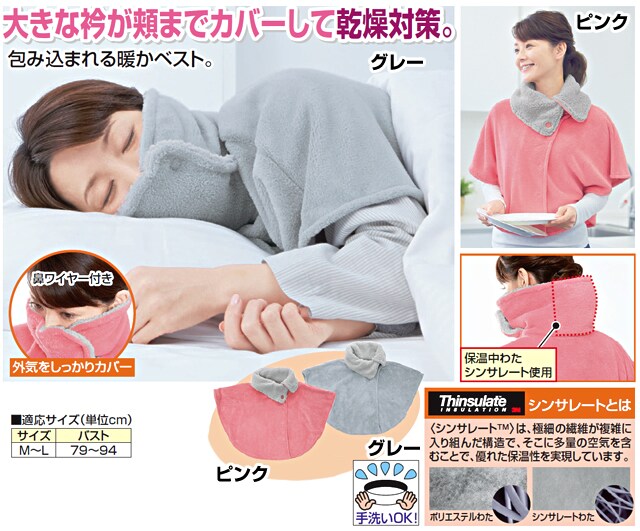 [ピンク]乾燥ガード頬まで暖かおやすみベスト | 大きな衿が頬までカバーして乾燥対策!