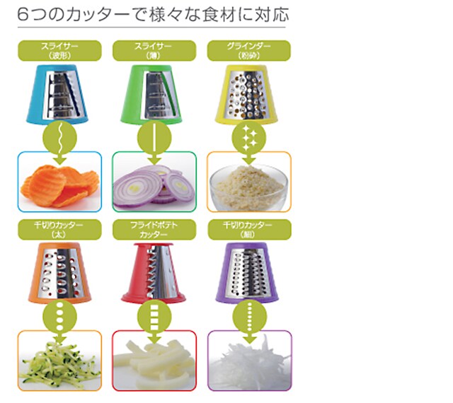 スライサー(薄い)、スライサー(波形)、千切り(太い)、千切り(細い)、グラインダー(粉砕)、フライドポテトブレード