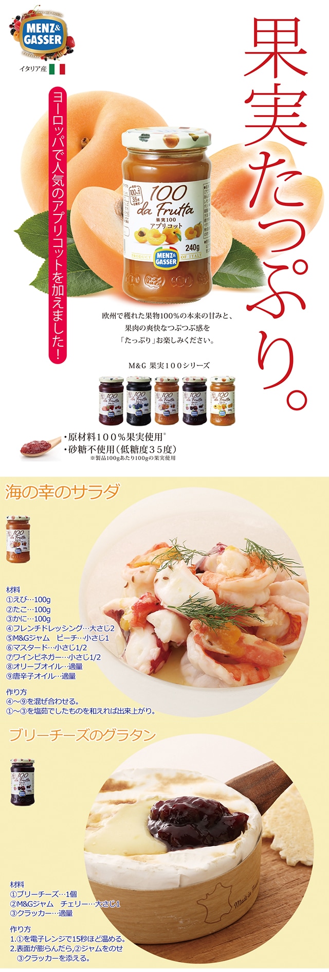 【果実100 アプリコット】あんず、濃縮ぶどう果汁、濃縮レモン果汁、ゲル化剤(ペクチン)
