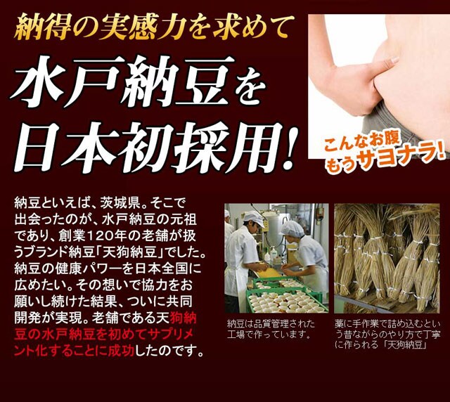 納豆といえば、茨城県。そこで出会ったのが、水戸納豆の元祖であり、創業120年の老舗が扱うブランド納豆「天狗納豆」でした。納豆の健康パワーを日本全国に広めたい。その想いで協力をお願いし続けた結果、ついに共同開発が実現。老舗である天狗納豆の水戸納豆を初めてサプリメント化することに成功しました。