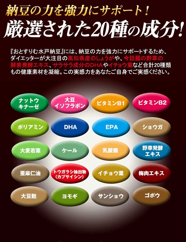 原材料 : 納豆粉末、精製魚油(DHA・EPA含有)、アマニ油、納豆菌培養エキス末、大豆麹(滅菌)、イチョウ葉抽出物、ヨモギ末、ショウガ末、サンショウ末、ゴボウ末、大麦若葉粉末、梅肉ペースト、梅酢、その他