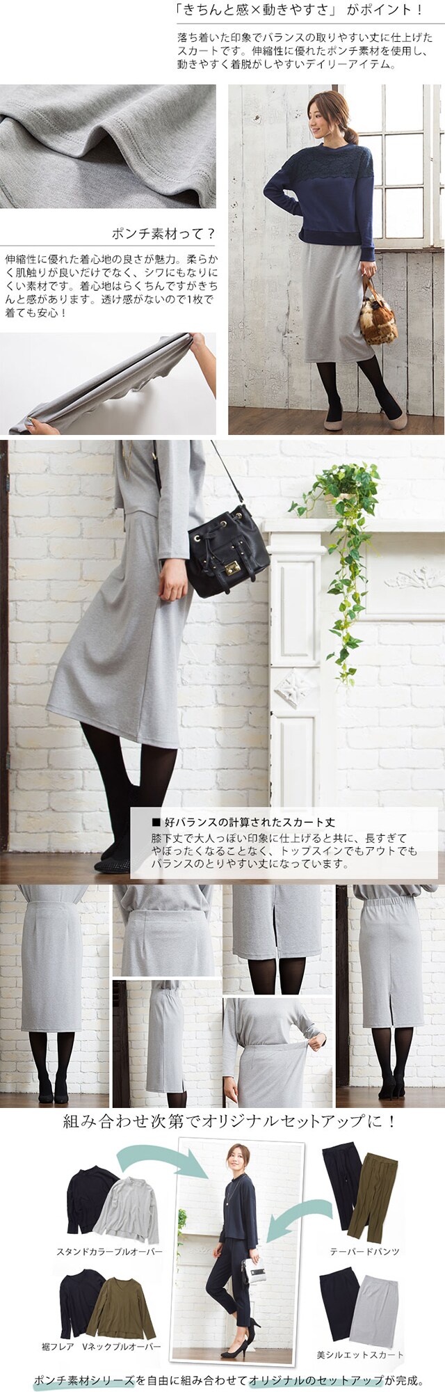 らくちんなのにきちんとキレイ!美シルエットなタイトスカートです。透けが気になりにくく伸縮性に優れたポンチ素材を使用し、デイリーに着用しやすく仕上げました。同素材のプルオーバーとセットアップとしても着用できます。(Aラインプルオーバー/34667509)(サイドスリットプルオーバー/34667501)