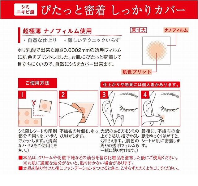 厚さはわずか0.0002mm。肌にぴったりとフィットして、シミやソバカス、ニキビ跡をカバーします。