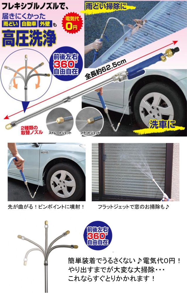 - 本体を家庭用ホースにつなげて蛇口をひねるだけで高圧洗浄ノズルに!先が曲がるウォータージェットフレキシブルミニ
