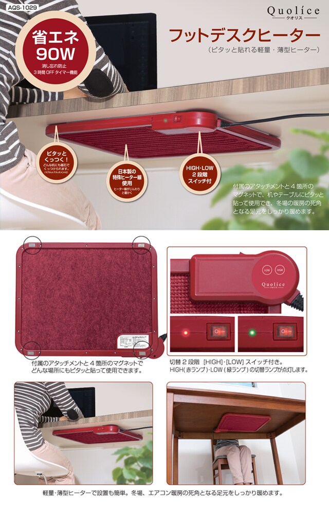 [レッド]Quolice フットデスクヒーター AQS-1029 | ピタッと貼れる軽量・薄型ヒーター!足元ポカポカ♪