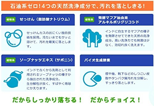 原材料 : 界面活性剤(12%、純石けん分[脂肪酸ナトリウム]、アルファスルホ脂肪酸エステルナトリウム、発酵マファ油由来アルキルポリグリコシド、ソープナッツエキス[サポニン]、アルカリ剤(炭酸塩)、水軟化剤(L-グルタミン酸二酢酸塩)、工程剤、酵素