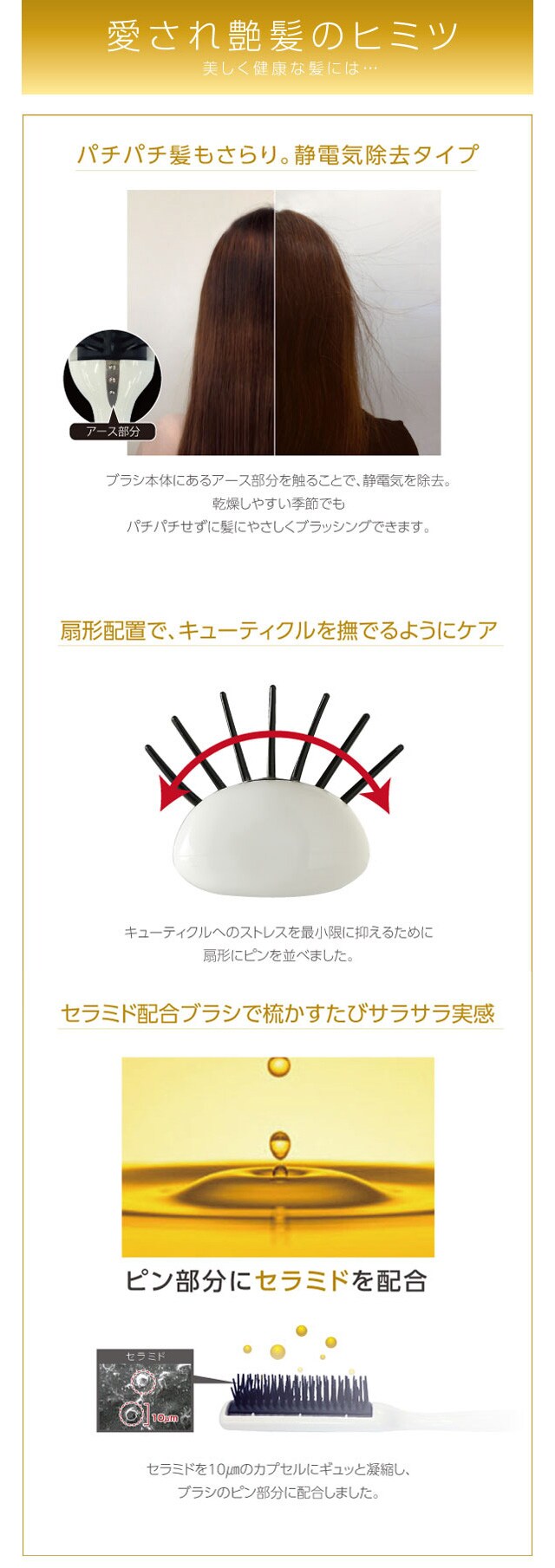セラミド配合のブラシが梳かすたびに髪を艶やかにします。静電気除去システムでブラシから静電気が除去され、ブラッシングするだけで艶髪にまとまります。