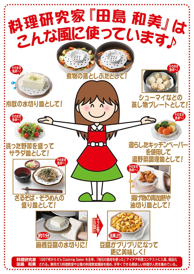 ・電子レンジで揚げ物の温め直しに使えば、余分な油が穴から落ちて、カラッと仕上がりヘルシーです。
