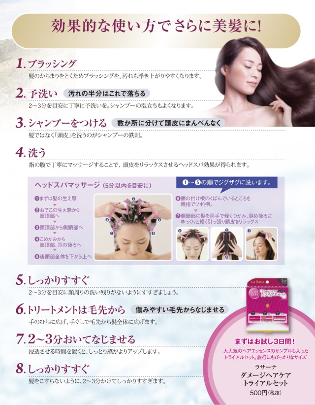 シャンプー:髪を濡らしてから適量を手に取り、頭皮をマッサージしながら、やさしく泡立てて、洗います。その後、十分に洗い流してください。