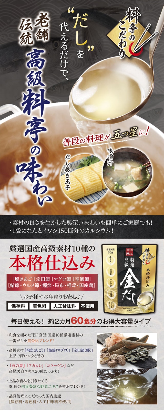 老舗伝統「匠の味」料亭のこだわり 特選!高級金だし 300g | いつもの料理を高級料亭の味わいに!厳選国産素材&イワシ150匹分のカルシウム◎約60食分