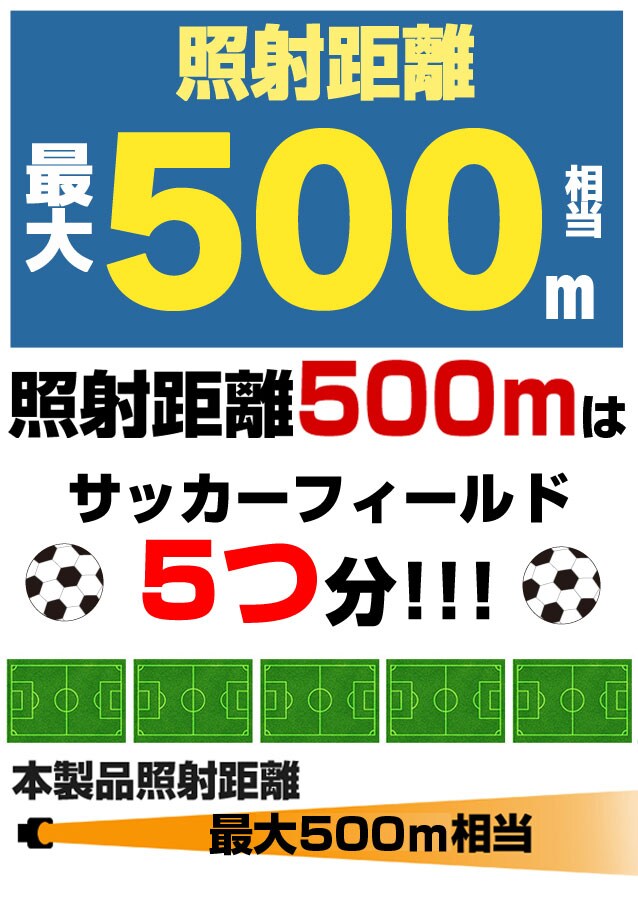 スポットビーム時は約500m先まで光が届く超高輝度LED採用。遠くまではっきりと照らすことが出来るので、暗い夜道でも安心♪