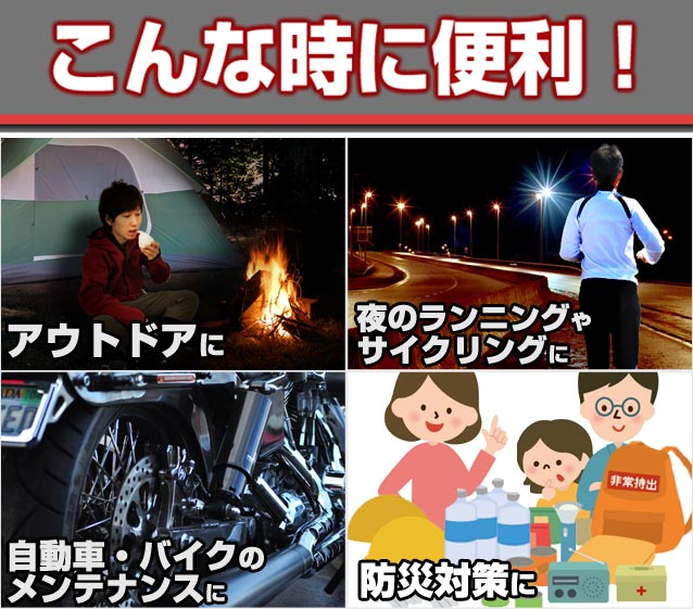 釣りやキャンプなどのアウトドアから、自転車の補助灯や車・バイクのメンテナンス時など様々なニーズに対応!