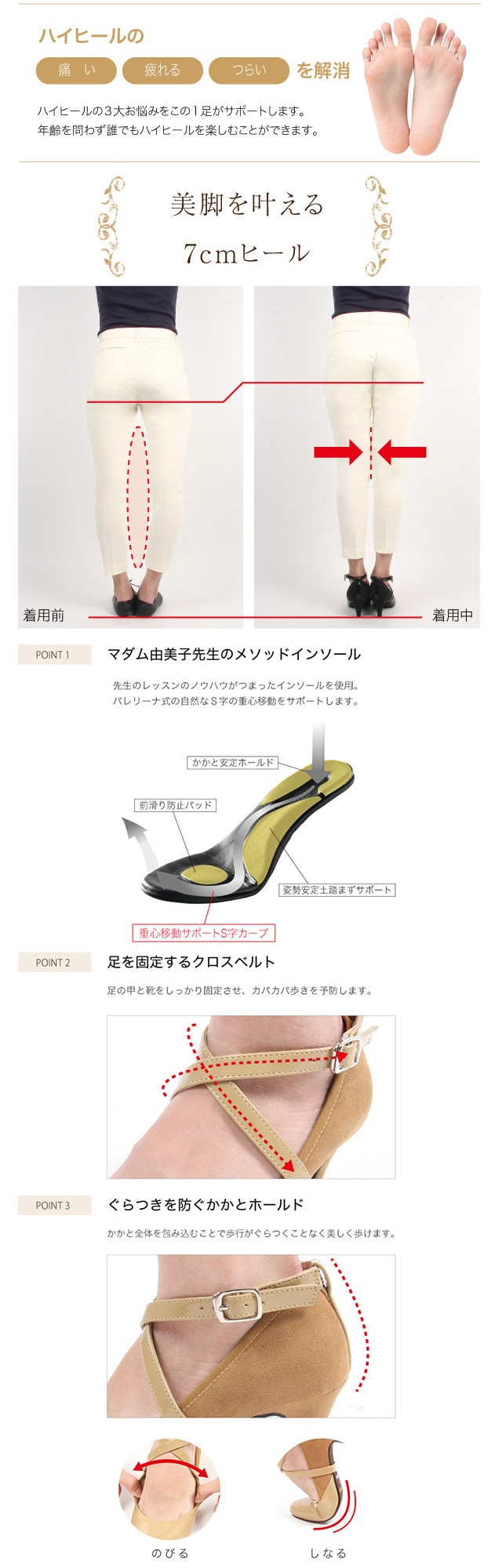 ハイヒールを履くと全身バランスが変わり、足が長くなるのはもちろんのこと、腰の位置が高く、顔が小さく、ボディも細く見えます。これらは全身の比率の変化がつくりだすものです。本品は、バレエの理論の基、正しい歩き方が出来るように設計されておりますが、履きやすい工夫が施されております。今までハイヒールを諦めてしまった方に、是非ともおすすめします。