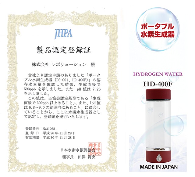 ポータブル水素生成器 HD-400F | いつもの水道水を入れてスイッチ1つを押すだけ!簡単