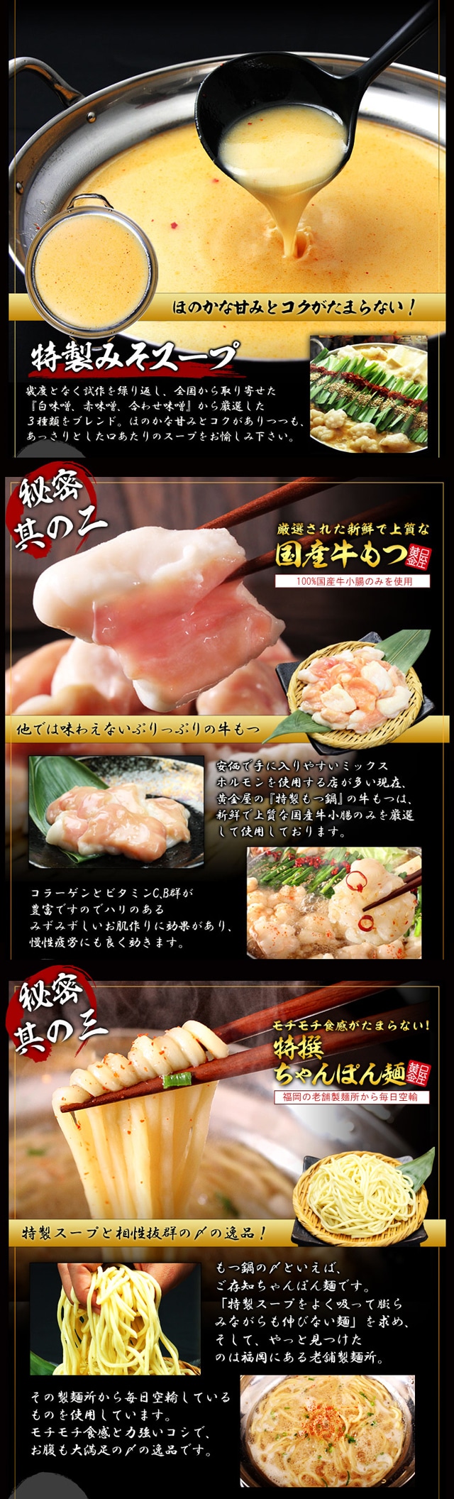 一切機械を使用しない手作り製法のもつ鍋セット。スープで使用している味噌は、幾度となく試作を繰り返し、全国から取り寄せた白味噌、赤味噌、合わせ味噌から厳選した3種類をブレンド。ほのかな甘みとコクがありつつも、あっさりとした口あたりのスープに仕上げました。牛もつは、コラーゲンが豊富で低カロリーの新鮮な国産牛小腸のみを使用。〆の特撰ちゃんぽん麺は、しっかりとしたコシと風味が自慢の特製麺を、福岡の老舗製麺所から毎日空輸にて直送しています。黄金屋がこだわり続ける本場の牛もつ鍋を、ぜひお楽しみください。