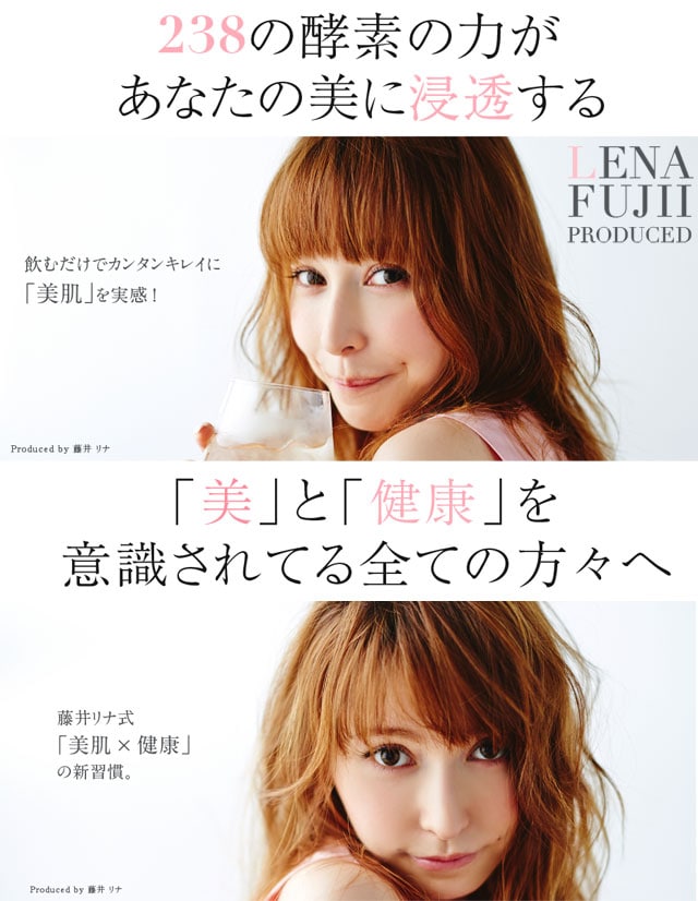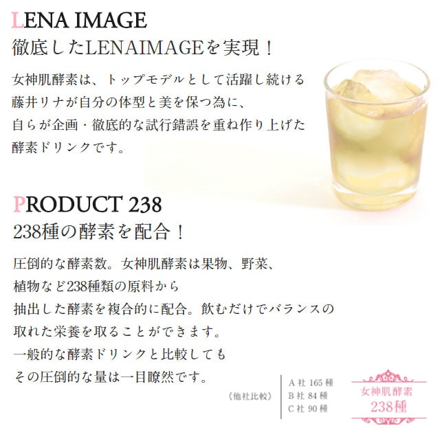 女神肌酵素は、トップモデルとして活躍し続ける藤井リナが自分の体型と美を保つ為に、自らが企画・徹底的な試行錯誤を重ね作りあげた酵素ドリンクです。