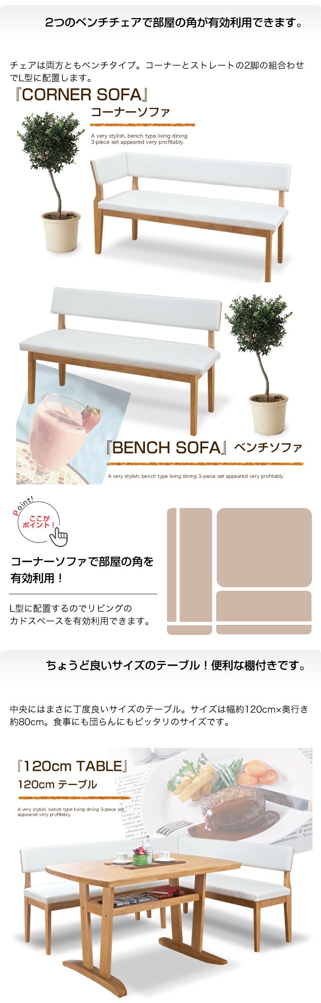 サイズ/テーブル:約幅120×奥行80×高さ70cm、コーナーベンチ:約幅139×奥行51×高さ76cm、ベンチ:約幅122×奥行51×高さ76cm