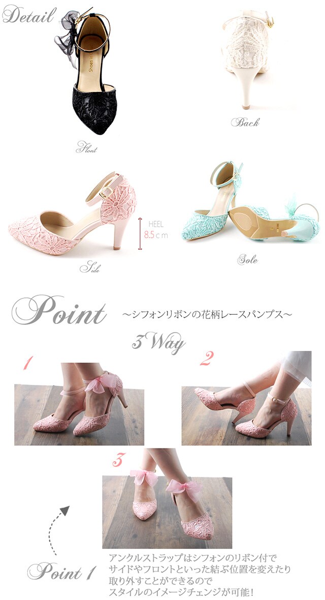 安定した履き心地をアシストするアンクルストラップにはシフォンのリボン付で、サイドやフロントといった結ぶ位置を変えたり取り外すことも出来るのでシーンに応じてスタイルのポイントに♪